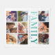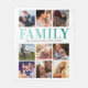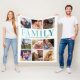 Editable family fleecy blanket featuring a chic white background that can be changed to any colour, 9 square photos, the word "FAMILY" in a stylish teal gradient font, plus yours, your partners, and childrens names.