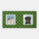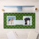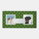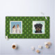 Custom family and dog photos with jade leaves on forest green background.