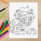 Somewhat haphazardly enhanced 3-story high family trailer is towed by a small car. There is a small vegetable garden on the roof, complete with a scarecrow. An open bathtub on the second floor. A garbage can at the back of the trailer. Some laundry is drying on the wind. Various family pets include a dog, a cat, a chicken, and even some goldfish. A small boy is waving from the trailer window.