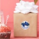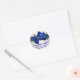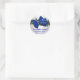 A beautiful round shaped sticker with a cobalt and navy blue FAUX satin ribbon resting on a Xmas wreath filled with snow berries and green leaves that has the words, Merry Christmas, and a template for your families name, which pop against a vibrant silver grey background. IDEAL FOR - Decorating your paper products and presents this Xmas season.