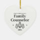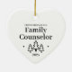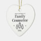 First Christmas as a family counsellor heart ornament for a new job. Elegant porcelain ceramic holiday ornaments in white with black lettering. Featuring Christmas trees and stars.