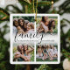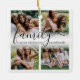 Modern happy family christmas ornament featuring a 4 photo collage of you, your family & friends, and the cute saying "family is anyone who loves you inconditionally" in a trendy script and serif font.