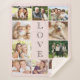 A pink photo collage keepsake sherpa blanket featuring 10 family photos and "LOVE" written vertically down the middle in open typography.