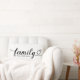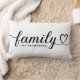 Modern and stylish custom lumbar throw pillow design features simple and minimal "Family" typography that includes flourish and heart details. Personalise the uppercase text below with a monogram or year established. The black and white colours can be modified.