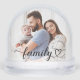 Modern and stylish custom Christmas snow globe features a favourite photo with a minimal black "family" typography overlay design that includes elegant flourish and heart details. The black script text colour can be modified.