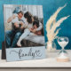 This custom plaque features your favourite photo on a light blue-grey background with a modern 'family' text including flourish and heart detail. Custom photo, background colour and text colour can each be changed to suit your style to make this tabletop easel back photo plaque uniquely yours.