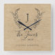 Custom monogram and name with family established year and place elegant chic farmhouse style beige burlap wall clock. +++++++ A modern keepsake gift for weddings, anniversaries, housewarmings, Thanksgiving, Christmas holidays.