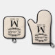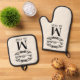 Enhance your kitchen decor with a touch of personal history using this elegant pot holder and oven mitt. Adorned with a chic antique black coloured filigree scroll on an ivory background, your family's monogram, and the date of establishment in a black typography style on a cream ivory background, it's not only practical for handling hot dishes but also serves as a personalised artwork that brings some elegance into your home.