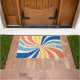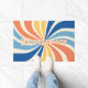 With a retro twist, personalize your doormat with a 70s inspired, colorful sunburst. The family name or other custom text is in layers, with the top layer being outlined text. The sunburst features creme, orange, yellow, light blue, and blue colors.