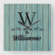 On this stylish wall clock are teal blue rustic wood planks with a letter and family name that you can customise it making it uniquely your own. Rustic farmhouse vibes.