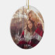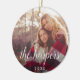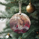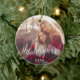 Simple and elegant holiday ornament features a photo on each side with your family name or custom caption overlaid in white calligraphy script lettering. Personalised with the year beneath.