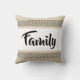 Fun family throw pillow. Beige background with fun black pattern at top and bottom. White is in the centre with the word Family in a fun and pretty typography. Fun and stylish!