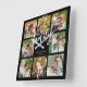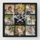 Create your own diy modern black and white 8 photo collage personalised keepsake wall clock with a trendy handwritten script and your family name or text.