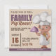 Search no more for your Family pig roast invitation with this cute illustration of a pig pitmaster extraordinair wearing a chef hat and apron, holding a wooden spoon in one leg, and holding a cloche up in another leg. Cute and perfect for a family barbecue get together.
