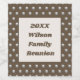 Personalise your next family reunion dinner with this inexpensive wine bottle label. The polka dot pattern features silver circles against a dark brown background. A large rectangle in the centre features brown and beige colours and provides a solid background for your personalised reunion information. Quickly and easily customise the year and your family name. These wine bottle labels also offer a simple and unique way to create keepsakes for your reunion guests.