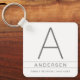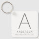 Personalised Family Reunion Favour Keychains with large initial, family name, and reunion date in a minimal and modern simple design in grey and white.