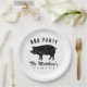 Family reunion party custom paper dinner plates. Disposable throw away party supplies for group gathering, engagement, wedding, dinner party, food event, garden BBQ, farm etc. Vintage pig design for meat lovers. Add your own surname or farm animal logo. Fun rustic summer design for bacon and pork lovers. Customizable background color. Available in small and big size.