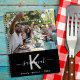 A chic black background. Personalise and add your own photo, a name, monogram letter and a text. The name is written in white with a large modern hand lettered style script with swashes. The monogram letter in grey. To keep the swashes only delete the sample name, leave the spaces or emoji's in front and after the name