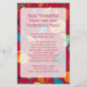Thanksgiving dinner family menu for fun at home. With the family cooking, baking and gathering together, why not create a fun keepsake menu for the occasion? This menu has a layered appearance with maroon text printed over a transparent panel. The background pattern is colorful and bold with pumpkins, autumn leaves, berries and mushroom images. Both the title and menu offerings are added in paragraph form with enough room for listing the chef / baker next to each food item. Include more spaces, or remove them as needed to fit your list. The back of the paper has the same bold autumn design. Paper upgrades are optional.