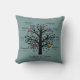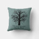 Family Keepsake Throw Pillow, Black Tree with Names & Dates, Add Parents' Names and wedding date at the trunk of the tree. Eight birds in the tree, with room to add names and birthdays for up to eight children or grandchildren. Back of Pillow has the same black tree, and below the tree, the following text: The start of a new Family Tree. Black on Blue pillow.