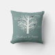 Family Keepsake Throw Pillow, White Tree with Names & Dates, Add Parents' Names and wedding date at the trunk of the tree. Three birds in the tree, with room to add names and birthdays for up to three children. Back of Pillow has the same white tree, and below the tree, the following text: Beginnings ~ A New Family Tree. White on Pale Slate Blue pillow