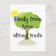 The genealogy design on this postcard includes a drawing of a tree with the sun and a cloud and the caption "Family Trees Have Strong Roots."s."
