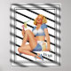 The portrait of the young lady has her wearing a striped blue and white top with the bra section being all white, with matching short pants and a white button skirt, as well as blue and white striped open toe and heel platform shoes; that are also have blue and white soles.