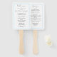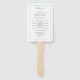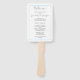 Minimalist fan wedding programs on a stick. White board with grey text templates in modern handwritten fonts to personalise for your event. Once the cards are attached to the stick, text will be on both sides. A thin, aqua blue line frames the text for a simple presentation that will match any theme.