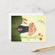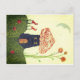 Fanciful postcard with mushroom house, two gnomes, a crescent moon, and fantastic flowers.