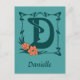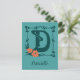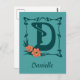 Beautiful art nouveau letter D. The letter and the fancy retro border are in deep cyan, the flowers are in brilliant vermillion.