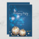 Stylish Gold & Silver christmas ornaments Christmas Holiday Invitation set on a modern blue bokeh background. Flip our chic holiday invitation over to view a festive matching back for an extra special touch. Beautiful invitation for a office party, company party, dinner party, christmas party, holiday party or any special occasion winter get together celebration.