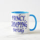Funny mug for the camper. Fancy blue text reads, "FANCY CAMPING MUG"