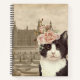 Whimsical bullet journal features vintage sepia tint background photo of a castle with manicured gardens and overlay of beautiful fancy black and white cat with floral crown