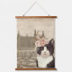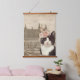 Whimsical wall tapestry features vintage sepia tint background photo of a castle with manicured gardens and overlay of beautiful fancy black and white cat with floral crown