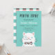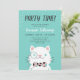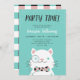 Cool birthday party invitation in turquoise with a fancy white cat wearing a monocle and bow-tie, white confetti, and PARTY TIME written in big black calligraphy letters.