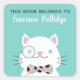 Turquoise bookplate sticker featuring a fancy white cat wearing a monocle and bow-tie. This book belongs to sticker. Add your child's name in white calligraphy.