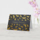 A birthday card with a pretty pattern - black background with fancy gold feathers floating downward. Sophisticated stylish design. The inside has a message which you can edit or personalise and a single pink watercolor feather above the text.