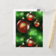 CUSTOMIZE with your own holiday greeting on the back of the postcard. Artistic gold and green scrollwork festively decorates the red Christmas ornaments in this detailed close-up. These fancy glass ball ornaments dangle on green ribbon in front of an abstract background of greenery and Christmas lights. A snazzy way to say Merry Christmas!