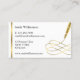 This copywriter business card features an elegant gold on white design with a stylish ink pen drawing a beautiful swirling handwritten embellishment. This professional business card would be suitable for many writing professions including; freelance copywriter, journalist, calligrapher, blogger, author, solicitor, scriptwriter, screenwriter, teacher, poet, novelist, songwriter, ghostwriter, article writer, columnist, playwright, creative writing consultant, resume writer, technical writer, eulogy writer, fiction writer, lettering artist, penman, copyist or scribe.