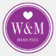 Deep purple and white monogram wedding favour stickers. Cute heart with monogrammed name initials of bride and groom plus date of marriage. Personalised thank you stickers or envelope sealers / seals for save the date cards and invites. Elegant stylish typography for bride and groom name initials. Chic design / fancy design. Customisable background colour. Romantic love theme design.