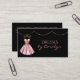 Glamourous dress seamstress business card, with graphics of a pink cocktail style prom dress, against a black background, with gold glitter looking accents. Personalise the text to suit your business needs. A lovely stand out card for your tailoring business.