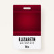 Personalised name badge with a red background decorated with elegant swirls and ornamental designs along the borders.