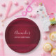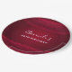 Birthday paper plates with a red background decorated with elegant swirls and ornamental designs along the borders.