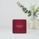 Business cards with a red background decorated with elegant swirls and ornamental designs along the borders. Simple font.