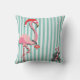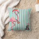 Deco inspired Flamingo dressed in Christmas stockings, Santa hat and wearing a ornament necklace on a aqua striped background with stylised palm leaves and candy cane. Hand drawn illustration by McBooboo.
