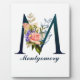 Beautiful and fancy florals include gold leaves, purple rose and navy blue wildflowers embellishments on large letter / initial M. White background. Customize with first/last names