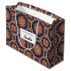 Gift bag with a repeating pattern of decorative ornate elements in flower, star and sun shapes.