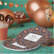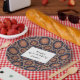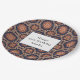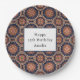 Paper plates with a repeating pattern of decorative ornate elements in flower, star and sun shapes.