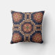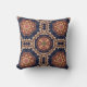 A pillow with a repeating pattern of decorative ornate elements in flower, star and sun shapes.