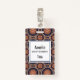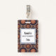 Name badge with a repeating pattern of decorative ornate elements in flower, star and sun shapes.